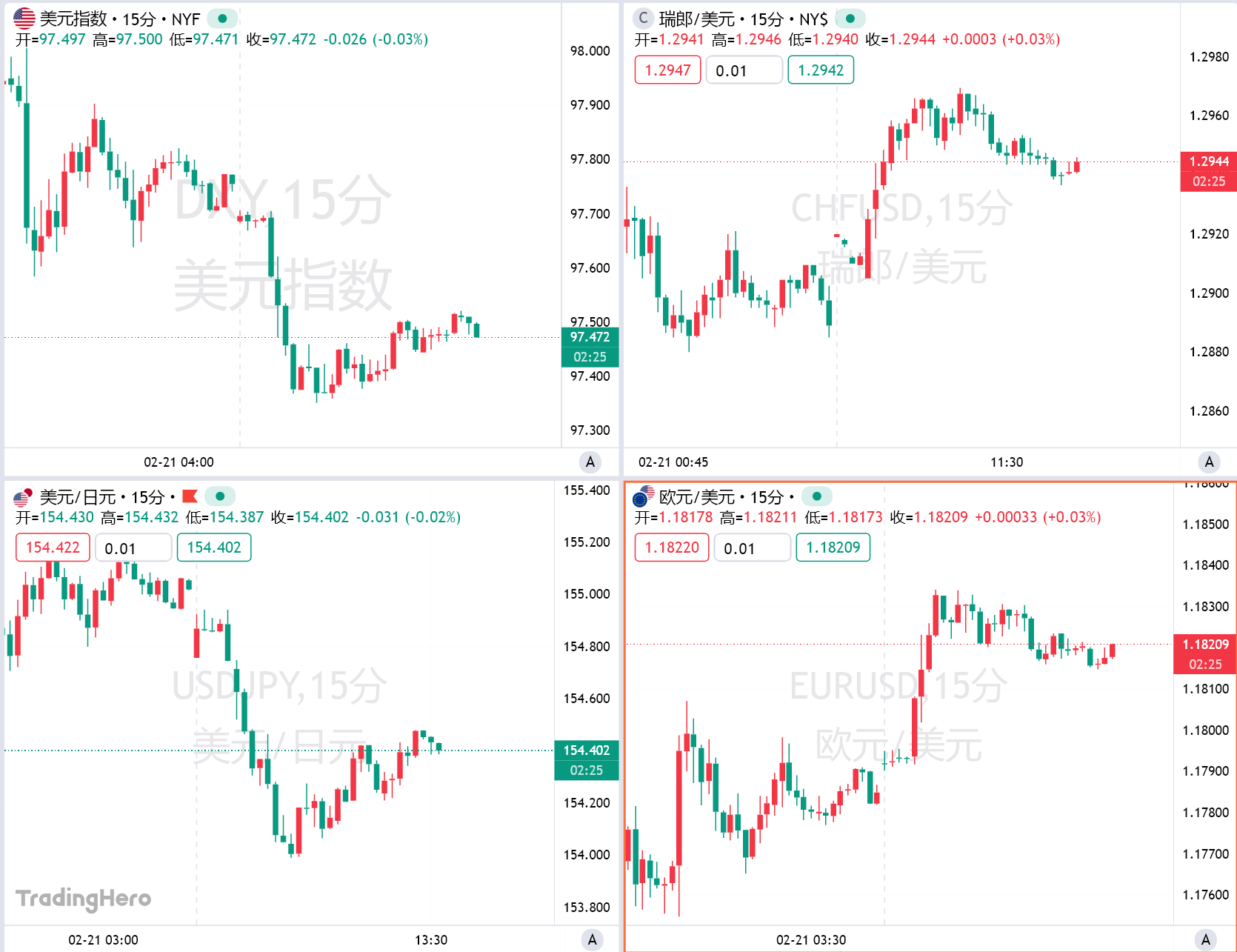 美元指数下跌0.3%,延续上周五跌势,因日本与中国休假,市场交投清淡。在美国最高法院裁定特朗普对等关税政策违法后,特朗普宣布对全球商品征收15%关税,瑞郎、日元与欧元兑美元领涨。